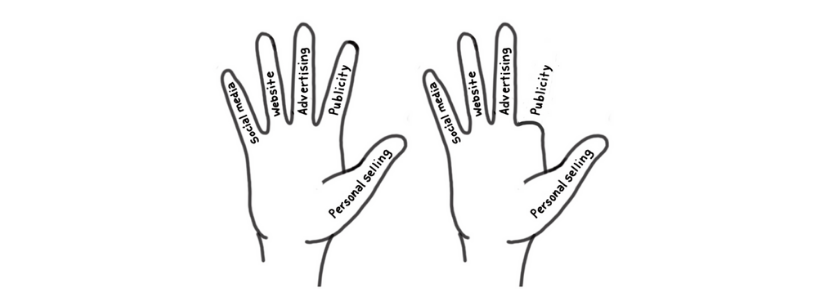 You can organize all the ways you tell people about your company and its products into five simple categories. The marketing term for that is the promotional mix. Think of it like a hand. The four fingers are publicity, advertising, website and social media. The thumb is personal selling: your sales people.